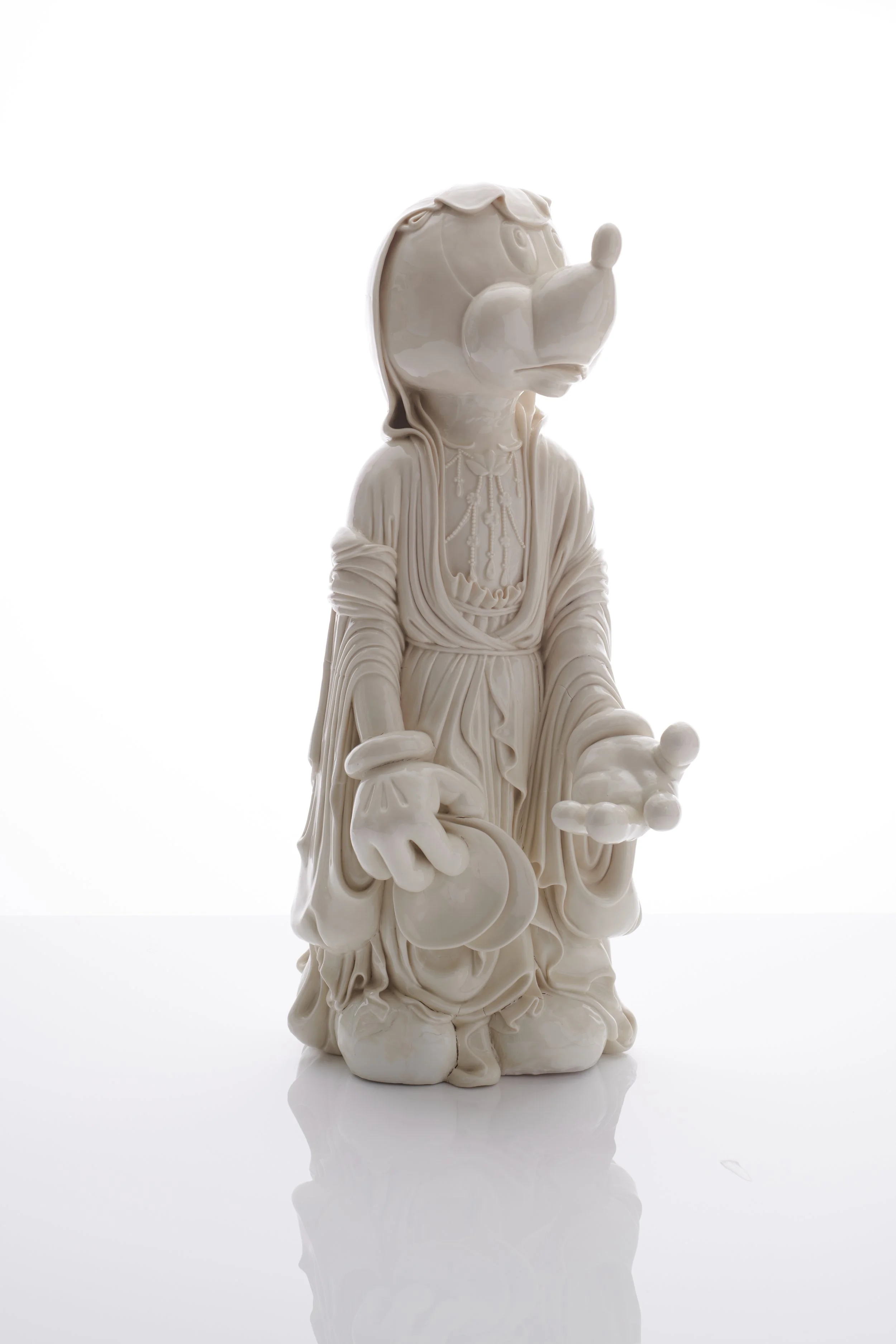 "East Meets West" delves into the intersection of two cultures through their iconic symbols. On one side, Mickey Mouse, arguably the most recognisable figure of Western pop culture, and on the other, the Imperial Guardian Lions and the bodhisattva Guanyin, revered symbols of Chinese heritage that have been carried by migrants around the world.